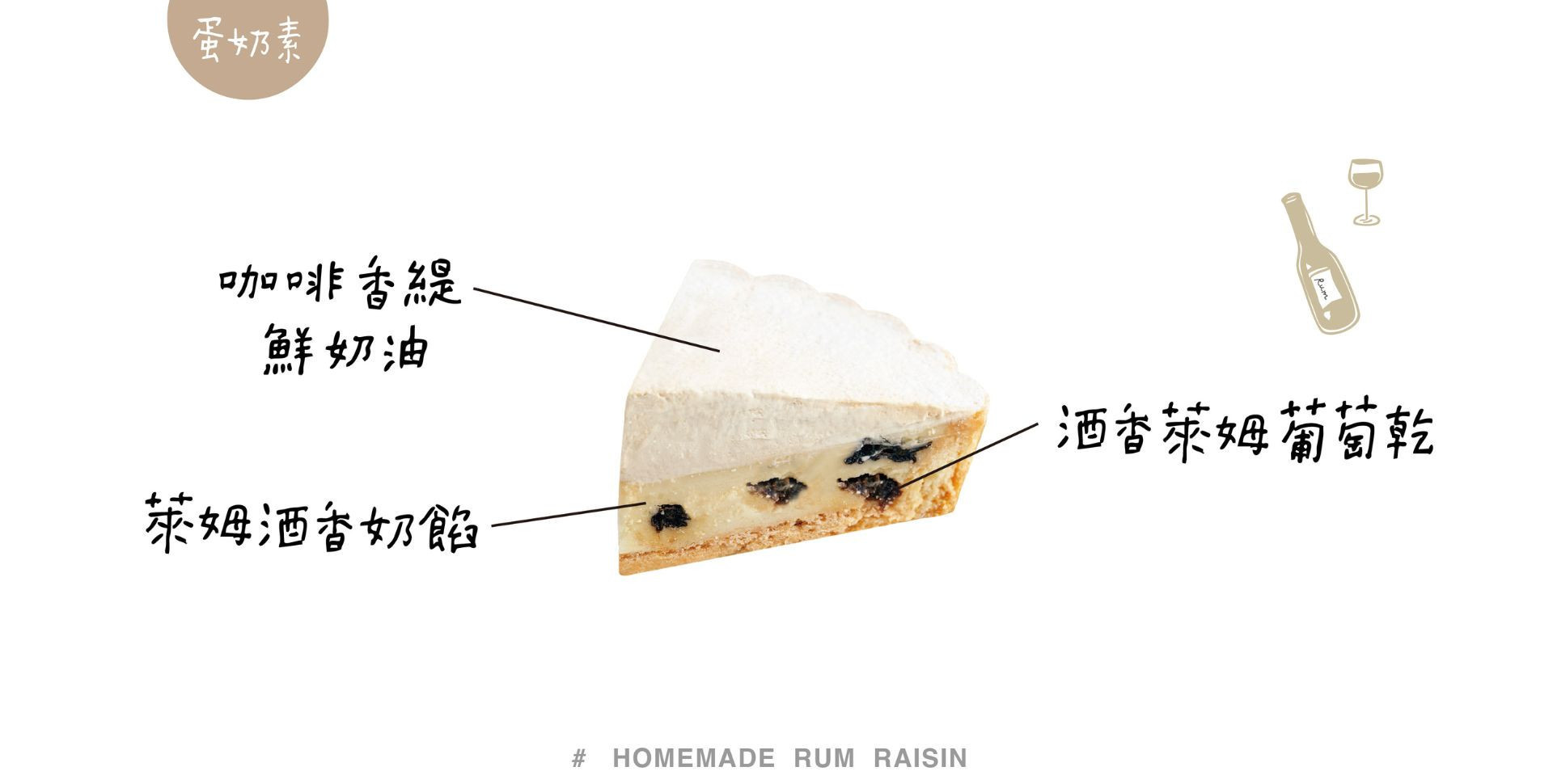 蛋、糖、牛奶、中筋麵粉、玉米粉、鮮奶油、葡萄乾、萊姆酒、咖啡粉、水麥芽、奶油、卡士達。